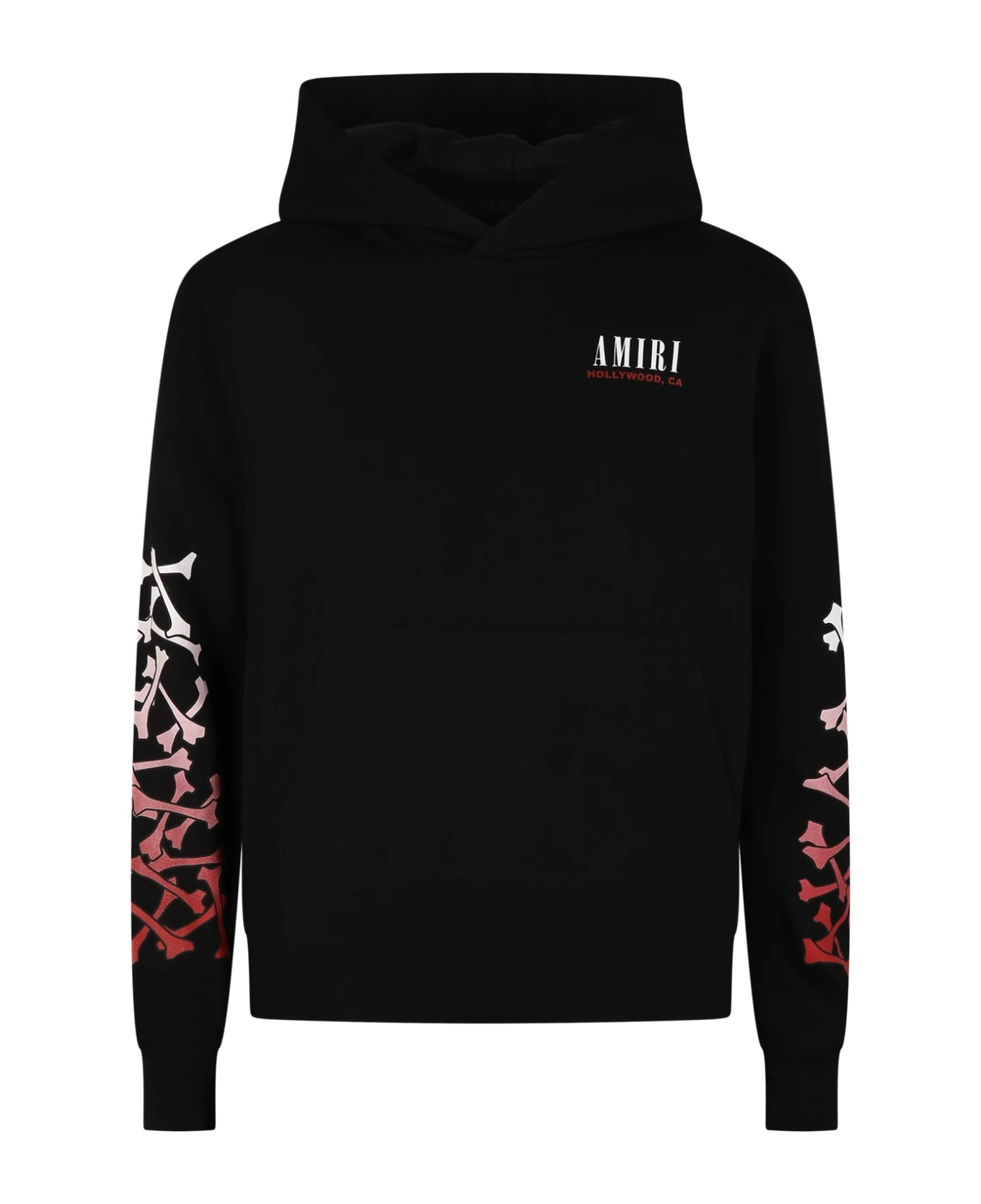 Black sweatshirt in brushed cotton, with long sleeves, hood, front pocket, ribbed cuffs and hem. It is embellished with logo on the chest and shaded bones print on the sleeves.