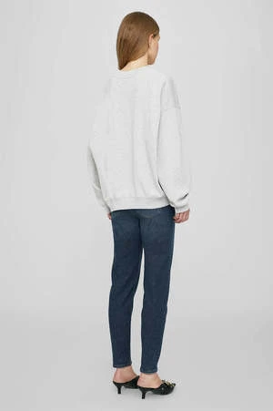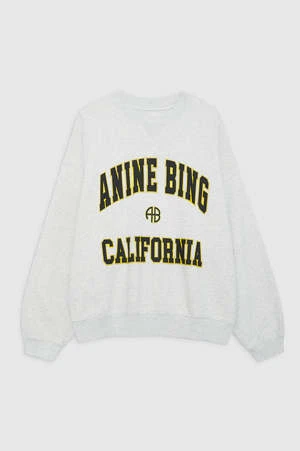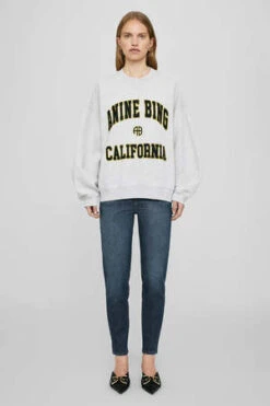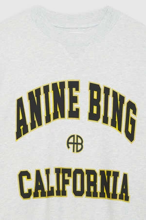 The Jaci Sweatshirt ANINE BING California is an oversized crewneck pullover made from midweight 100% organic cotton fleece in heather grey. This cozy separate features a centre V-stitch and an original ANING BING graphic screen printed at the chest in black authentic collegiate lettering with a contrast yellow outline.