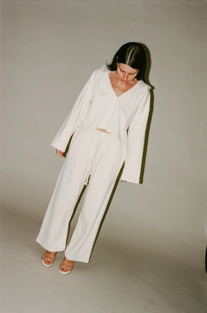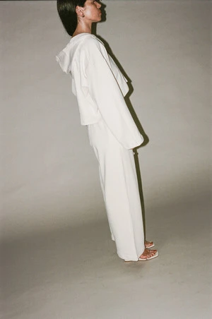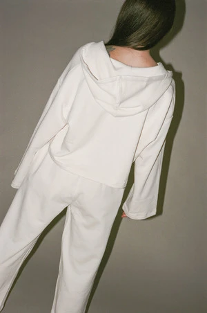 – Organic cotton sweatshirt with hood, deep v-neck, and drawstring at hood