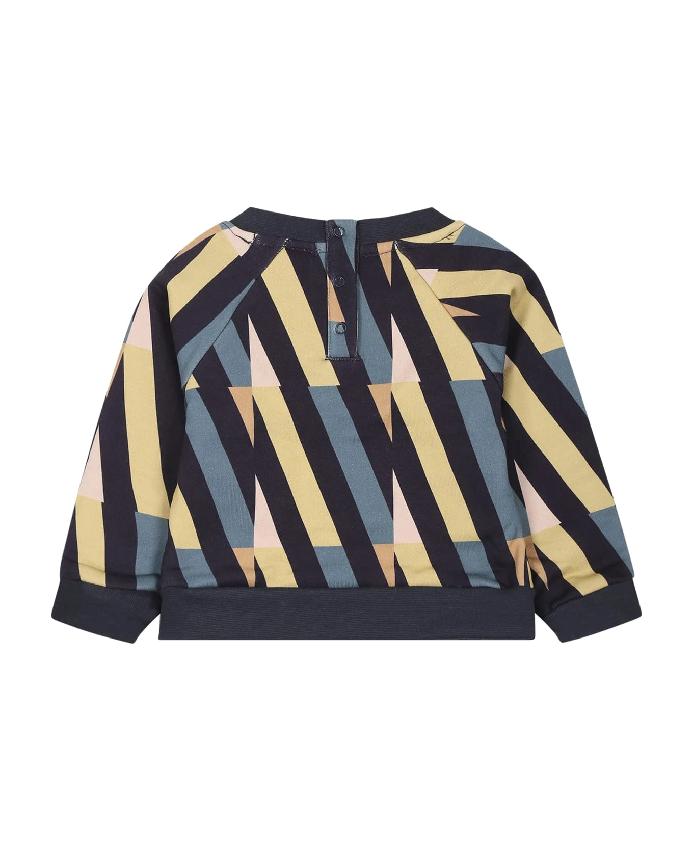 Blue sweatshirt in organic cotton, long sleeves, with ribbed crew neck, cuffs and hem, snap button closure on the back. It is embellished with all-over abstract lines print.