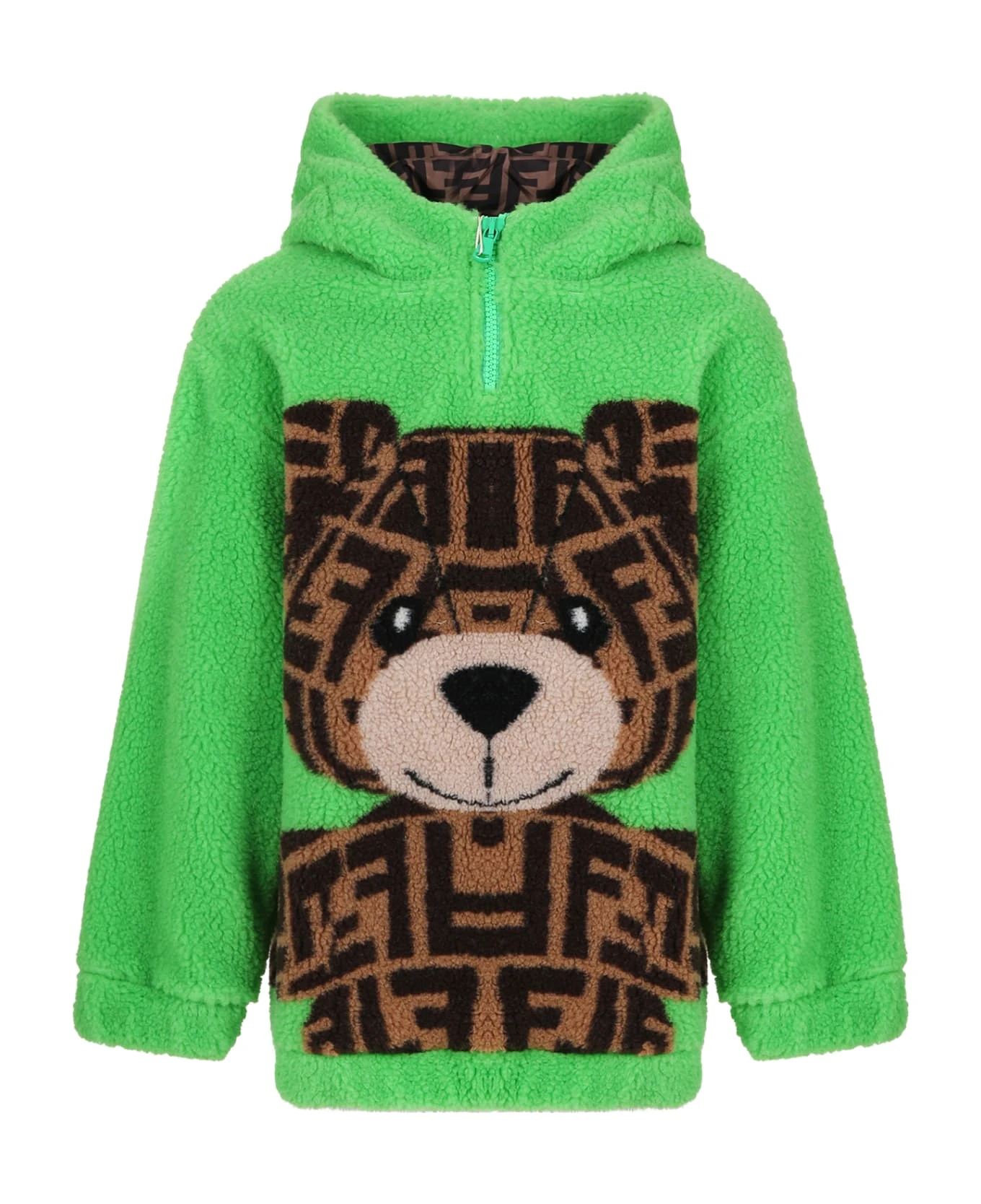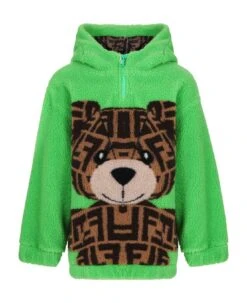 Green hooded sweatshirt with long sleeves and zip, made from soft wool fleece; it is embellished with large bear intarsia with tobacco FF logo, on the front and on the back.