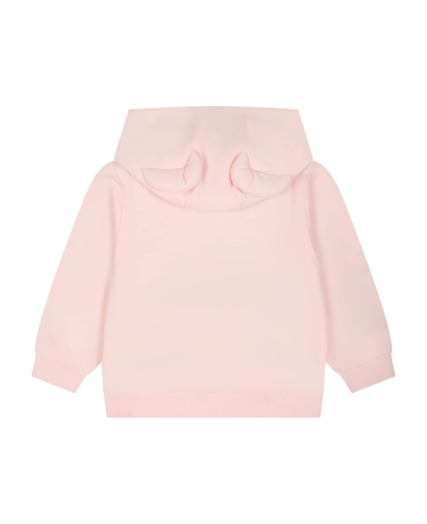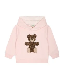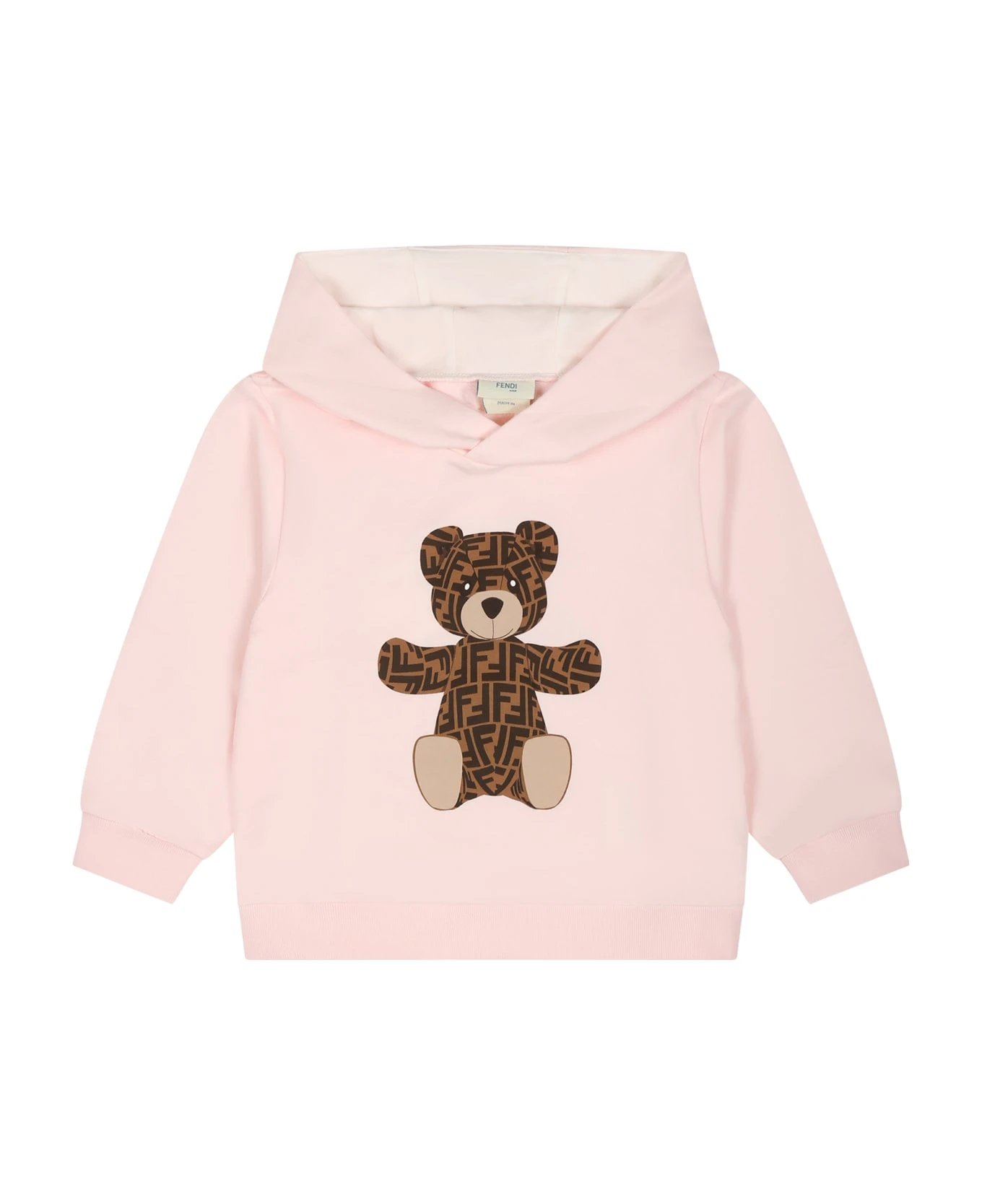 Pink brushed cotton sweatshirt, long sleeves, with hood with applied ears, ribbed cuffs and hem. It is embellished with bear with iconic double F, on the front.
