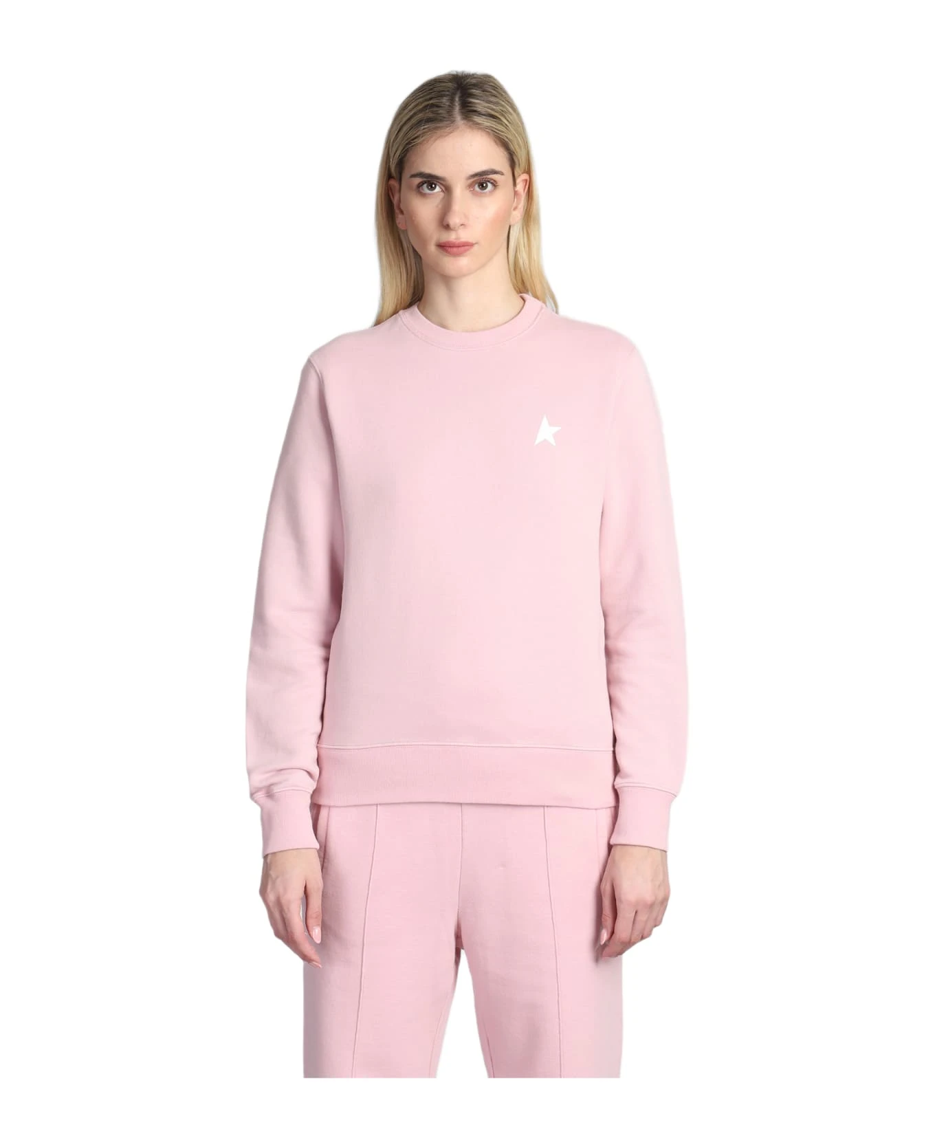Athena Sweatshirt in rose-pink cotton, round neck, long sleeves, logo on chest, ribbed cuffs and bottom, 100% cotton, Made in Italy, Model is 1. 83 and wears size M