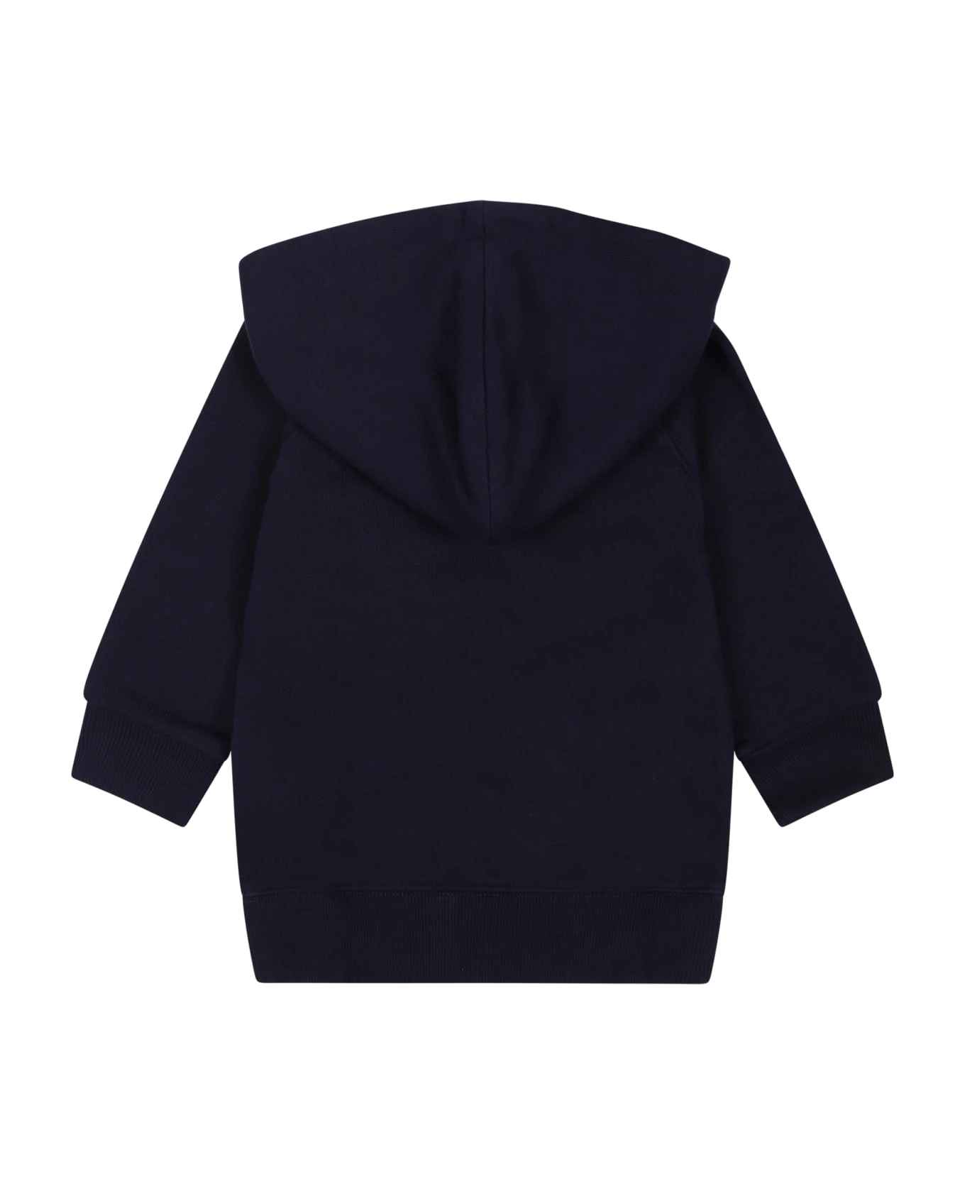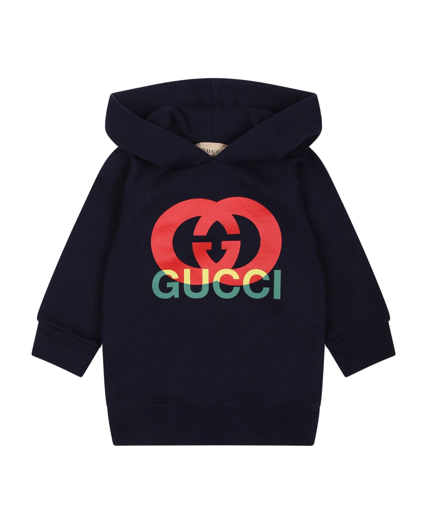 Dark blue hooded sweatshirt, made from brushed cotton,long raglan sleeves; it is embellished with interlocking G Gucci print on the front.