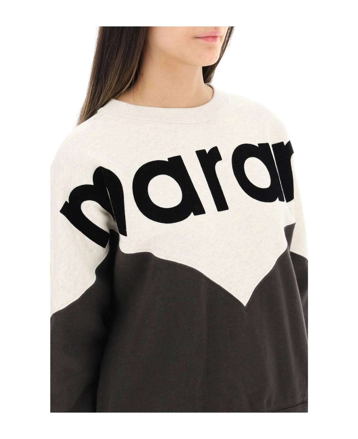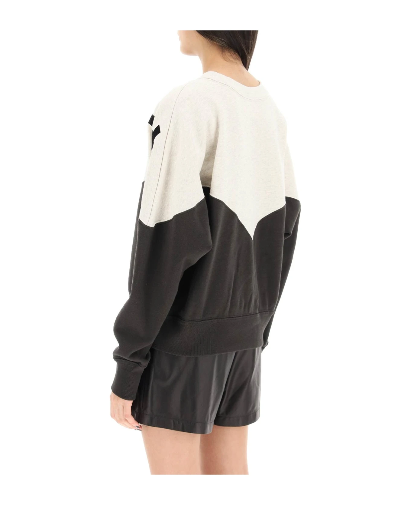 Oversized crewneck sweatshirt by Isabel Marant Etoile made of fleece-back cotton-blend jersey with a color-blocked design and contrast flocked lettering on the front. It is finished with rib knit trims and overlock stitching. The model is 177 cm tall and wears a size FR 34.