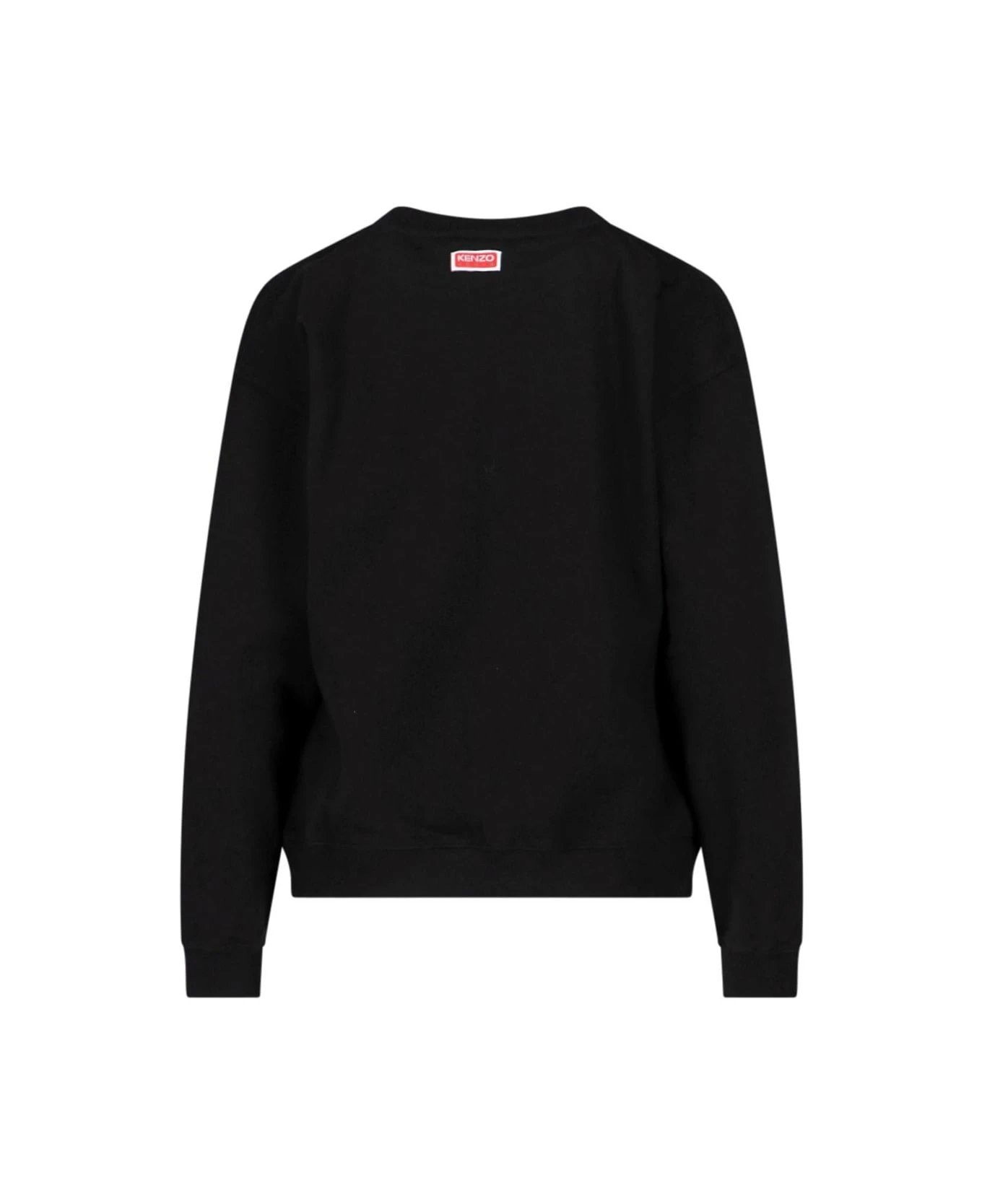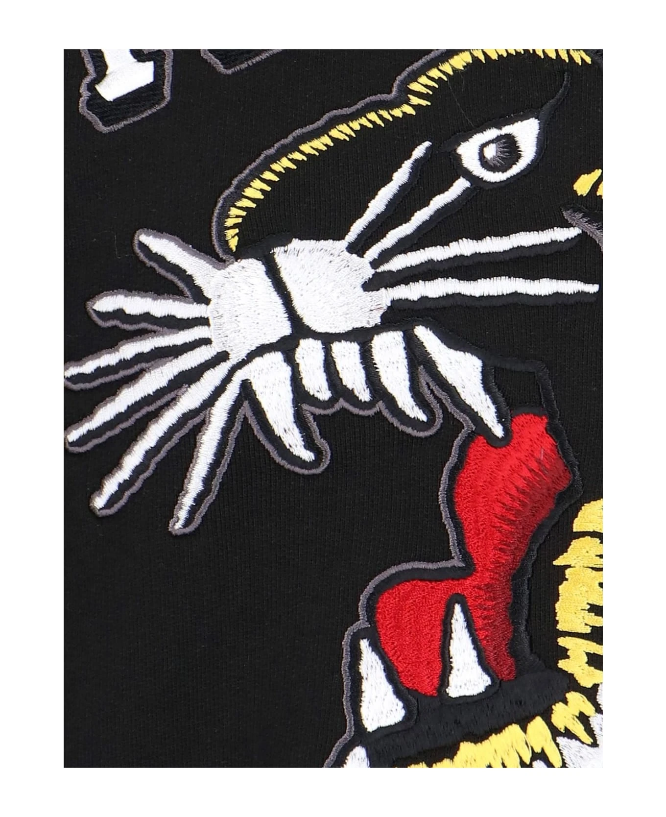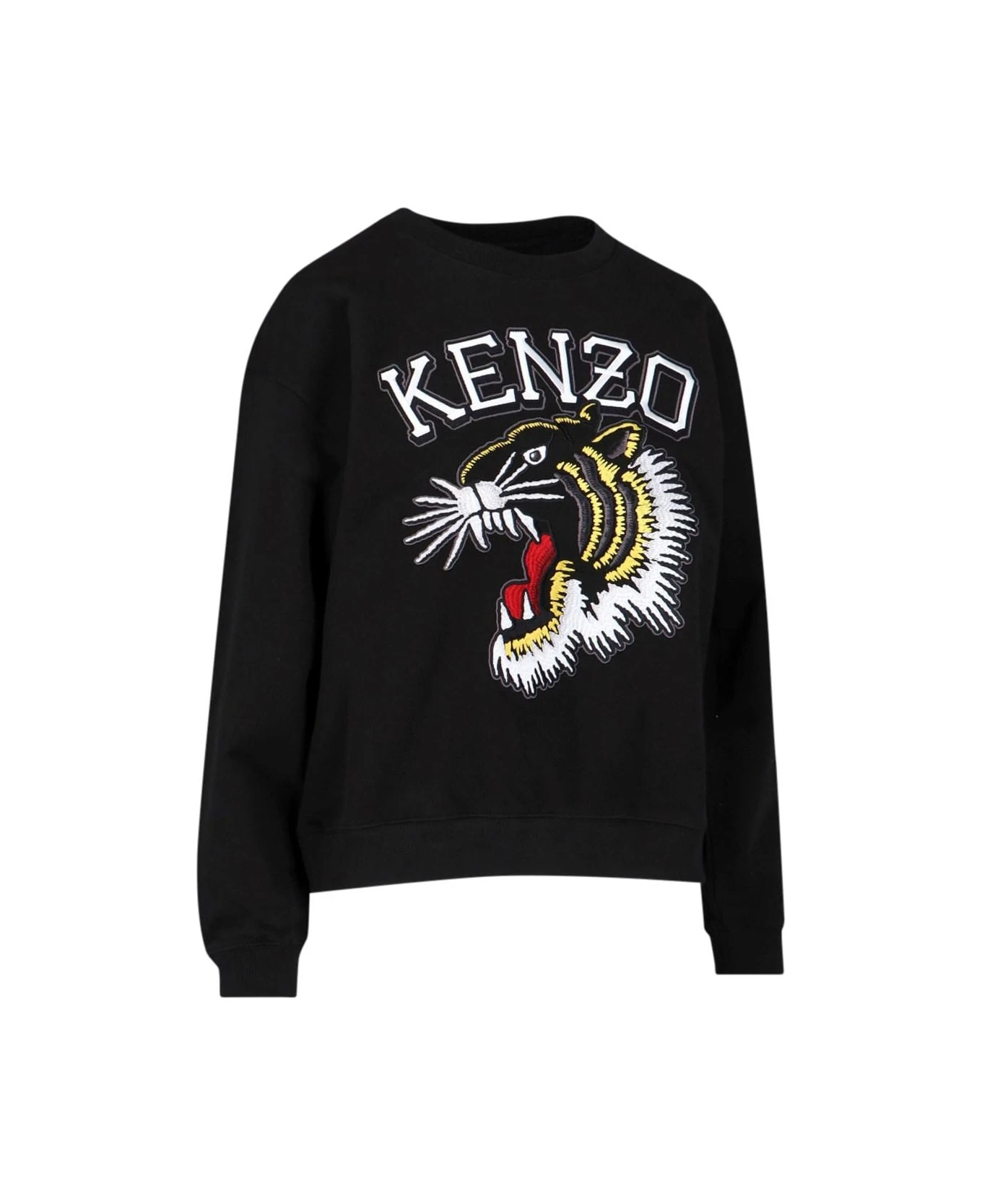 Kenzo Varsity Jungle crewneck sweatshirt in black cotton with dropped shoulders, white embroidered logo on the front, embroidered red and yellow tiger print details on the front, logo label on the back, ribbed finish, and straight hem.
