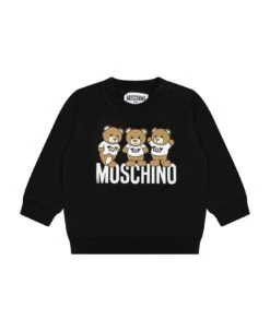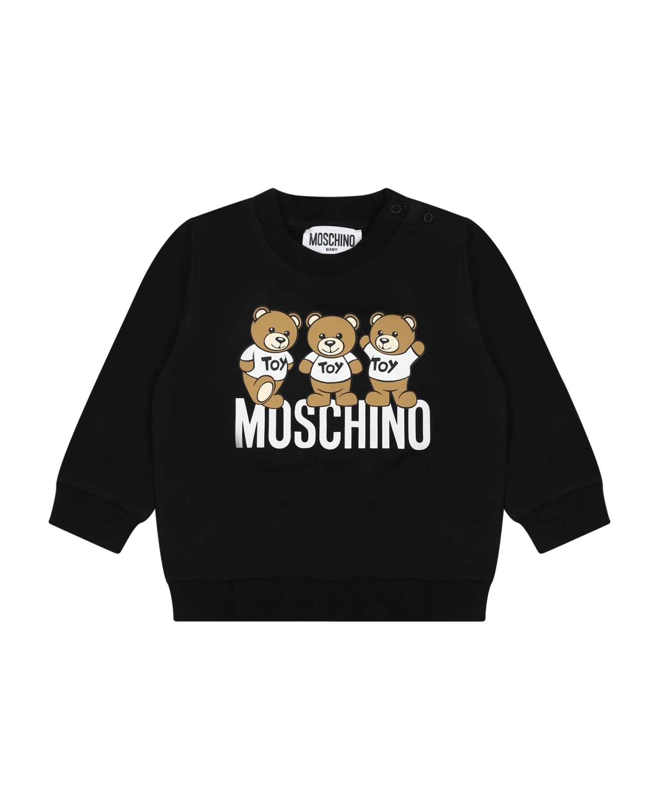Black sweatshirt in cotton fleece, with long sleeves, with ribbed crew neck, cuffs and hem, closure with press studs on the shoulder. It is embellished with three Teddy Bears and logo, on the front.