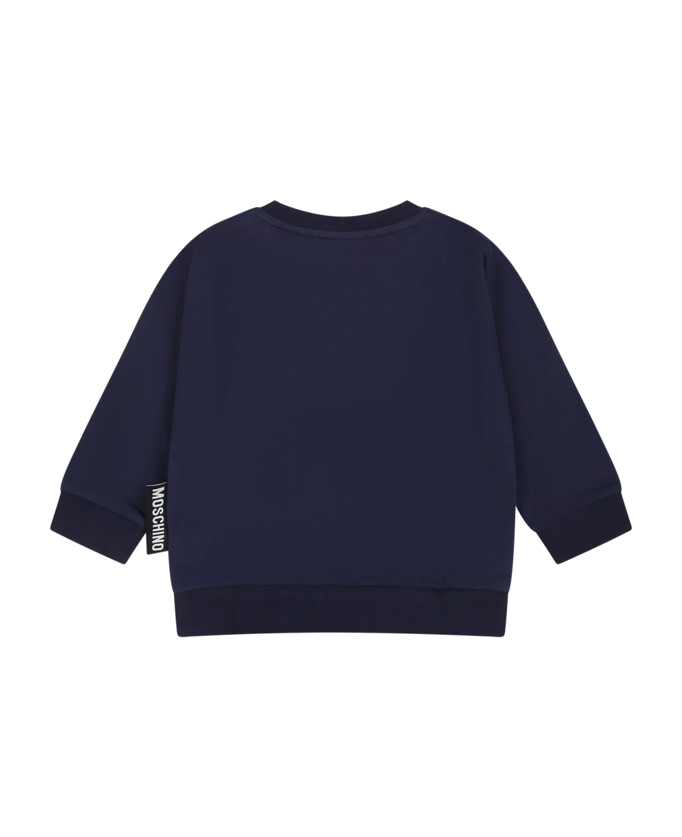 Blue sweatshirt in cotton fleece, with long sleeves, with ribbed crew neck, cuffs and hem and snap button closure on the shoulder. It is embellished with Teddy Bear applied on the chest and logoed patch on the side.