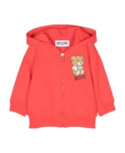 Red sweatshirt baby unisex. Signature Teddy Bear motif, hood, front zip closure, long sleeves and ribbed hem. 100% Cotton