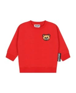 Red sweatshirt in fleece cotton, with long sleeves, with ribbed crew neck, cuffs and hem and snap button closure on the shoulder. It is embellished with Teddy Bear applied on the chest and logoed patch on the side.