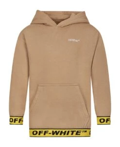 Brown sweatshirt in cotton fleece, with hood, long sleeves, yellow elasticated hem and cuffs. It is embellished with white logo on the front.