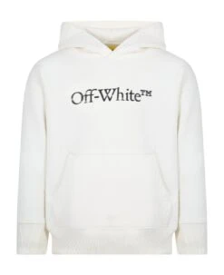 White sweatshirt in cotton fleece, with long sleeves, hood, ribbed cuffs and hem and front pocket. It is embellished with black logo on the front.
