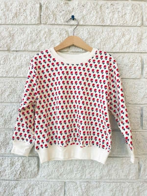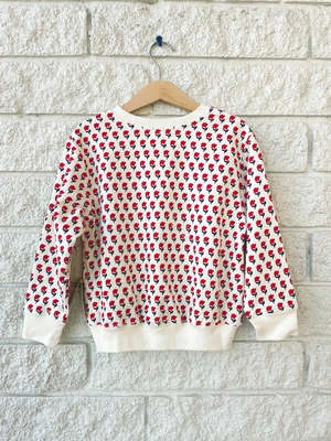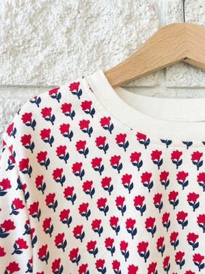 Girls organic cotton sweatshirt with tiny flower print and contrasting crewneck neckline and elasticized cuffs.