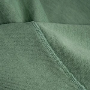 The fabric is 100% heavy cotton and the fit is regular. The stone wash process creates the color effect, slightly washed out.
