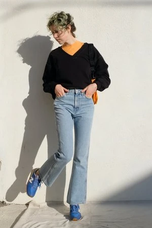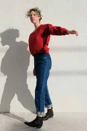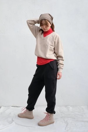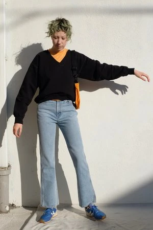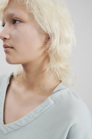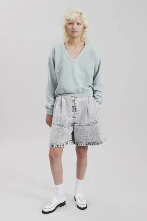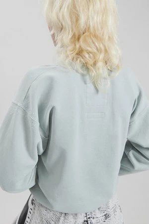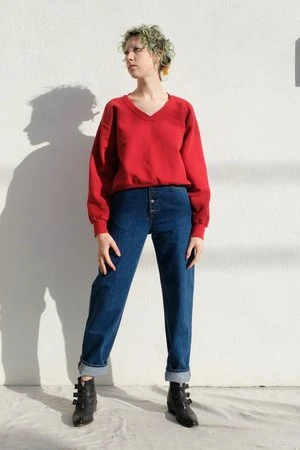 Vintage inspired V-neck sweatshirt with dropped shoulders and distressing details. Designed with a cropped length and relaxed fit.