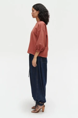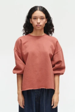 Crewneck sweatshirt with drop shoulders, cropped sleeves, raw edge hemline and unique distressing throughout. Makes a great styling piece for any look. color: brick.