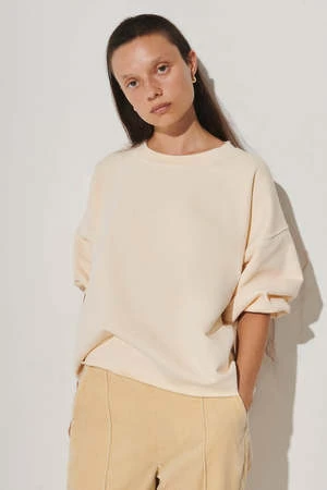 Crewneck sweatshirt with drop shoulders, cropped sleeves, raw edge hemline and unique distressing throughout. Makes a great styling piece for any look. color: butter.