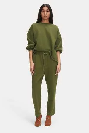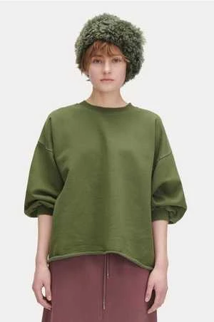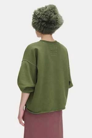 Fond Sweatshirt in Forest designed by Rachel Comey. A crewneck with drop shoulders, cropped sleeves, raw edge hemline and unique distressing throughout. Makes a great styling piece for any look.