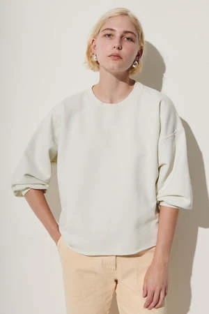 the fond sweatshirt is a crewneck style with cropped sleeves and a raw edge hemline. it’s a vintage-inspired silhouette with unique distressing throughout. color: mint.