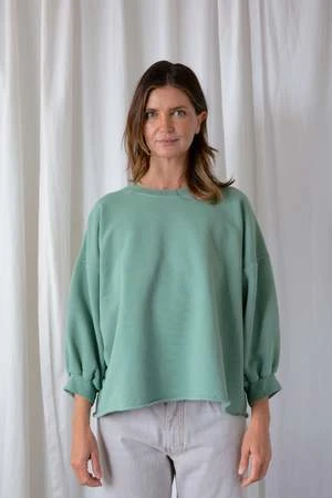 Crewneck sweatshirt in sage with drop shoulders, cropped sleeves, raw edge hemline, and unique distressing throughout.