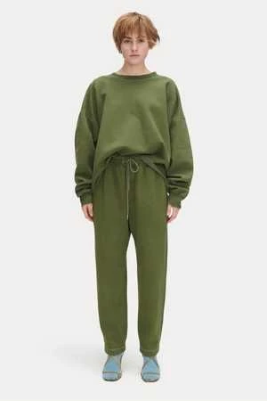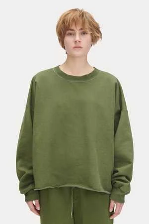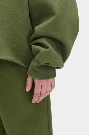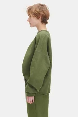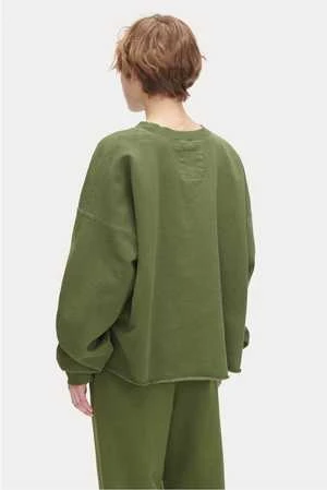 Fonder Sweatshirt in Forest designed by Rachel Comey. Oversized crewneck sweatshirt inspired by studio dancers, with drop shoulders, voluminous sleeves, raw edge hemline, and unique distressing throughout.