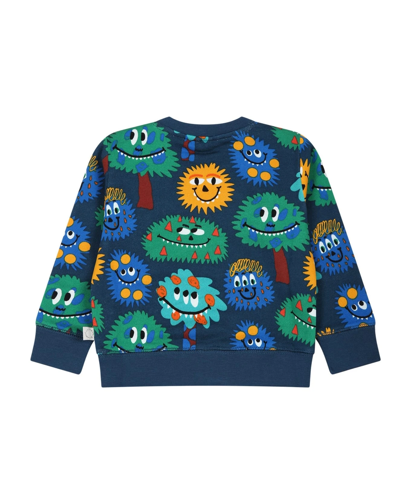 Blue sweatshirt in organic cotton fleece, with long sleeves, crew neck, ribbed cuffs and hem, snap button closure on the shoulder. It is embellished with all-over multicolor monsters.