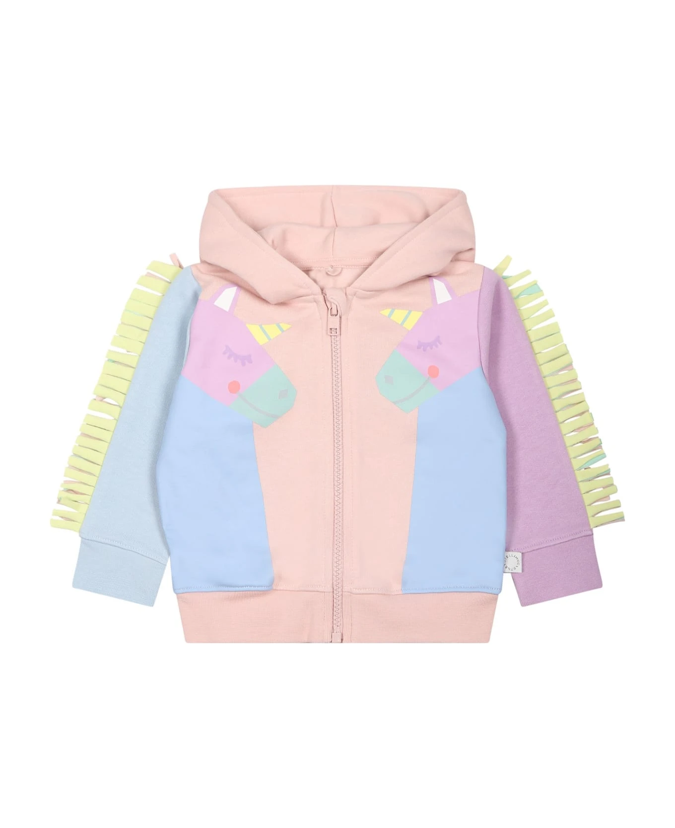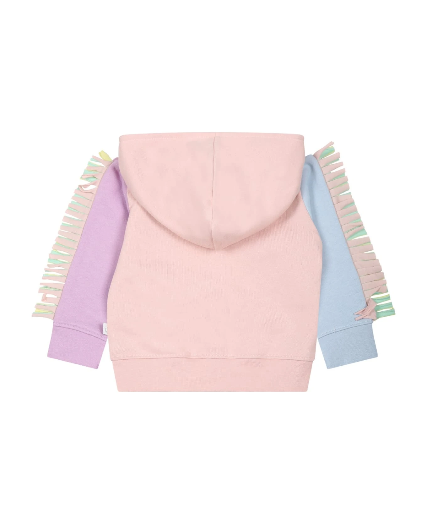 Multicolor sweatshirt in organic cotton fleece, with long sleeves, hood, ribbed cuffs and hem, front zip closure. It is embellished with unicorns on the front and fringes on the sleeves.