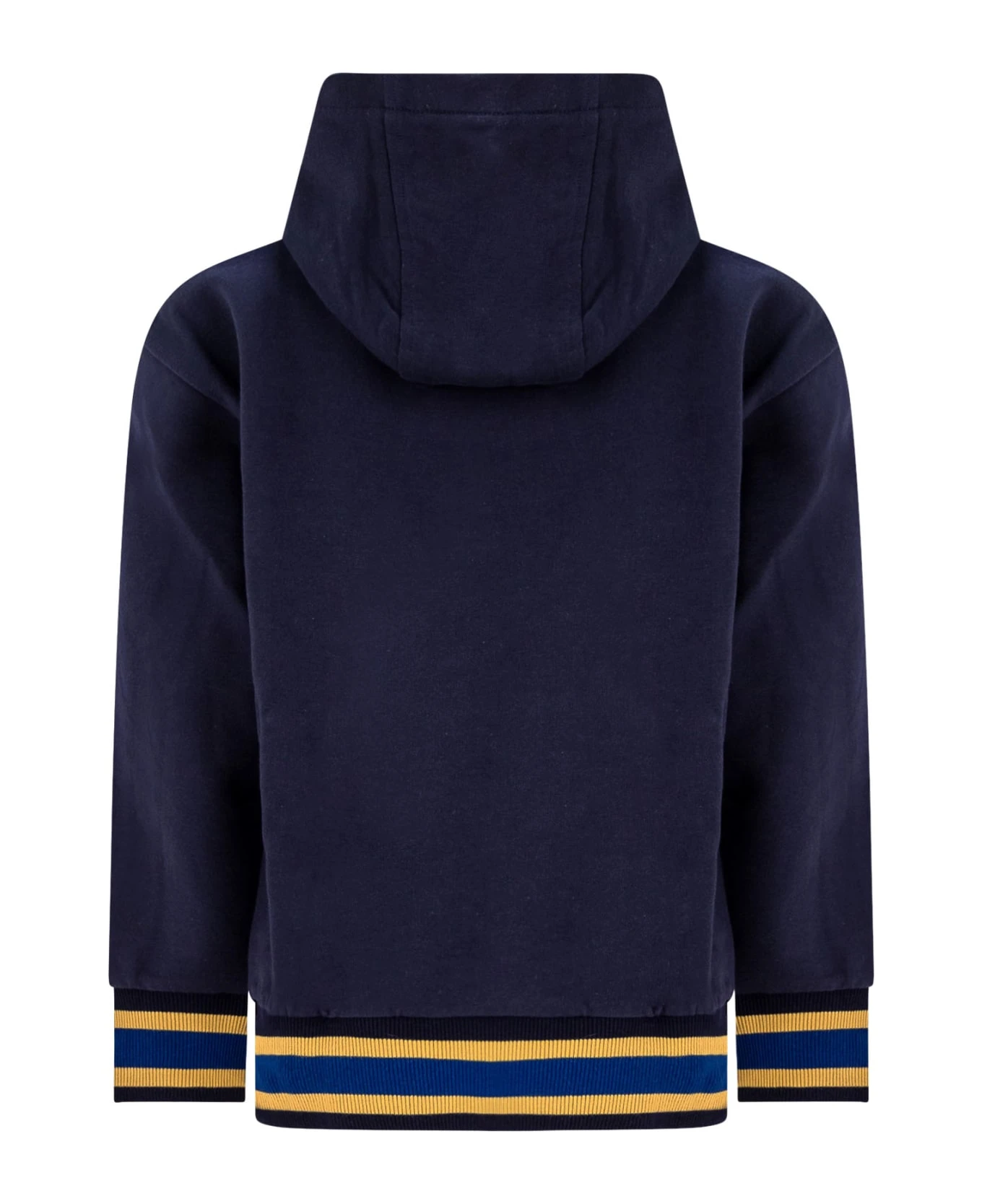 Blue hoodie. Front logo. Colored bands on cuffs and bottom. Ribbed cuffs and bottom.
