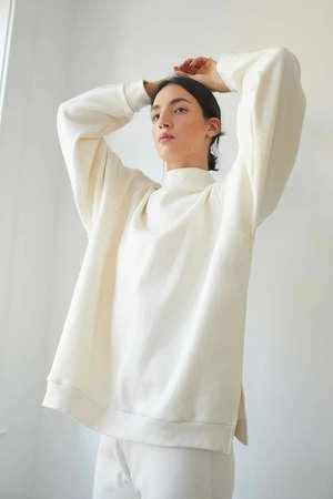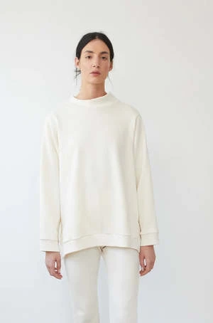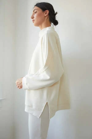 Oversized mock neck sweatshirt with our signature shoulder gusset seam detail in a longer length than our Easy Sweatshirt. Wide rib hem at bottom with side seam vents. A wide rib mock neck and rib cuff at sleeve. Done in our 100% USA grown and sewn organic cotton fleece fabric, ultra soft and fuzzy-inside.