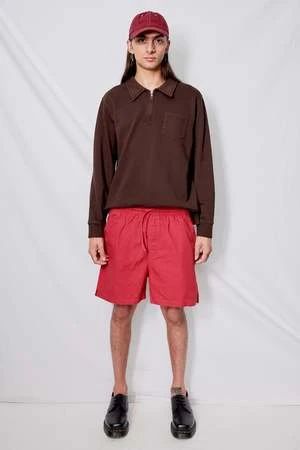Brown Sugden Sweatshirt from YMC. Collared loopback jersey sweatshirt, pigment garment dyed for a deep, dense finish. Fastens with a centred quarter zip, calling back to the kit of Mr Sugden in Ken Loachs Kes. Perfect for cold weather kickabouts.